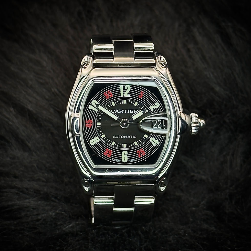 The Cartier Roadster Ref. 2510 captures a different side of Cartier design, blending the brand’s signature elegance with a more dynamic, automotive-inspired case shape. With its curved lines, tonneau profile, and distinctive date magnifier, the Roadster stands apart from more traditional round sports watches while still feeling unmistakably Cartier.