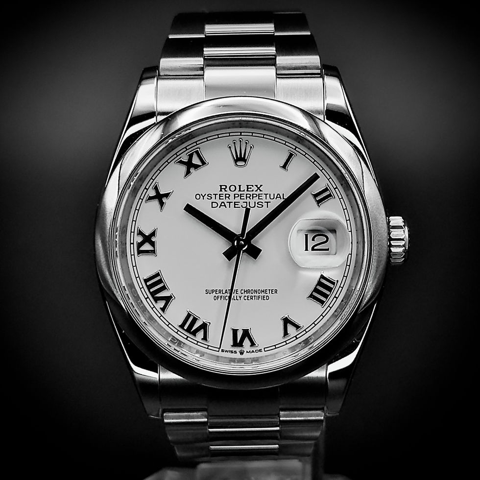 Timeless elegance meets everyday versatility in the Rolex Datejust 36, reference 126200. A cornerstone of the Rolex catalog, the Datejust has defined sophistication since its debut in 1945. This modern execution blends classic cues — a crisp white dial adorned with Roman numerals — with contemporary refinement.