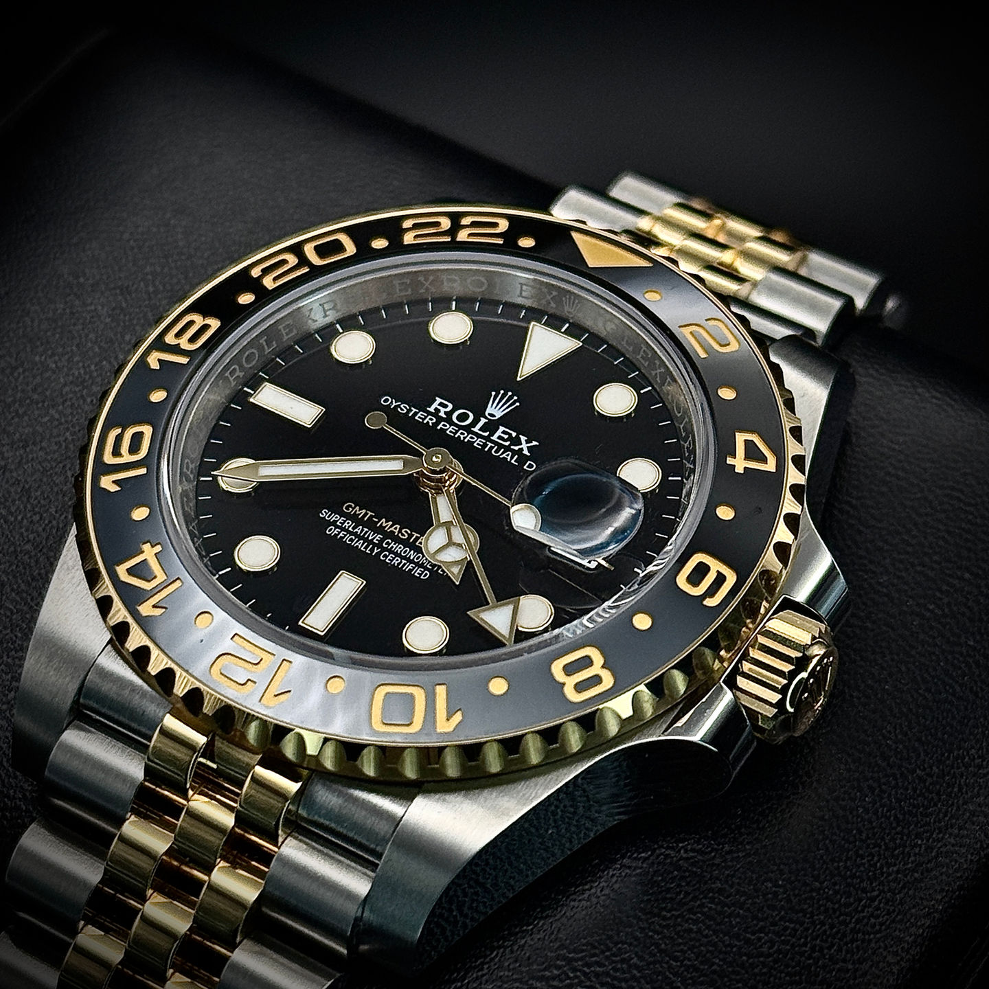 Its black dial and matching black-and-grey Cerachrom bezel strike the perfect balance between sport and sophistication, while the Jubilee bracelet adds that signature Rolex comfort and charm. Inside, the Caliber 3285 keeps time across multiple zones with a 70-hour power reserve and COSC-certified precision — whether you’re flying first class or simply living like it.